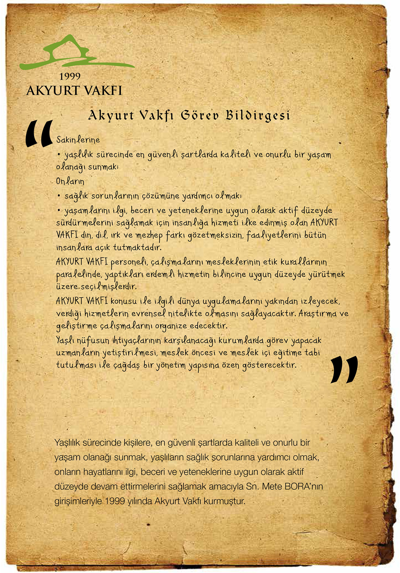 • yaşamlarını ilgi, beceri ve yeteneklerine uygun olarak aktif düzeyde sürdürmelerini sağlamak için insanlığa hizmeti ilke edinmiş olan AKYURT VAKFI din, dil, ırk ve mezhep farkı gözetmeksizin, faaliyetlerini bütün insanlara açık tutmaktadır.